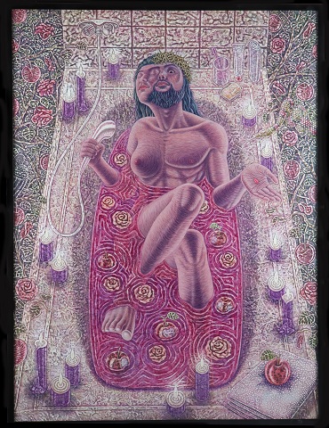 Florentino's “Nilay-Nilay” is a split-human, half-man and half-woman, cleansing itself in a tub of bitten apples and red roses. A challenging look haunts the Christ-half of the figure's face, while its womanly side relishes the apparent cleanliness the wash brings.