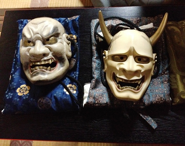 The sinister masks of traditional villains in the ancient Japanese theater form of Noh grimace up at reporters during ASEAN week in the city of Sakai in Osaka.
