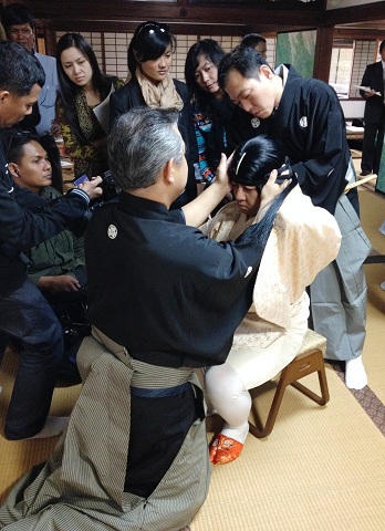 Nagayama and his colleague transform his jolly enthusiastic male student into a timid Japanese woman who lived centuries ago for a Noh performance.