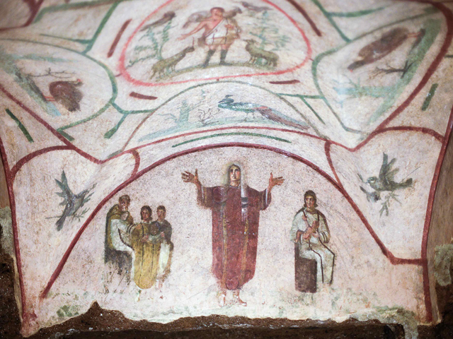 Bisconti said the fresco of the woman in a gesture of priest-like prayer was "a depiction of a deceased person now in paradise," and that the women sitting at the table were taking part in a "funeral banquet" and not a Eucharistic gathering.