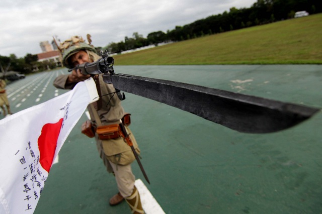 Role-playing a Japanese Imperial Army officer armed with an Arisaka type 99 rifle with bayonet.