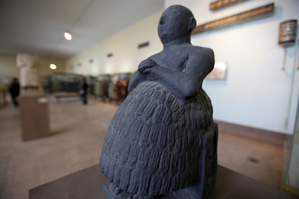 A black basalt statue of Dudu, the famous Sumerian scribe, dating from the early dynasty of Lagash in 2400 B.C. is displayed at the National Museum of Iraq in Baghdad December 31, 2013. Baghdad is set to fully reopen its treasured National Museum, home to priceless artefacts plundered in the unchecked chaos following the 2003 US-led invasion of Iraq. Picture taken December 31, 2013. REUTERS/Ahmed Saad