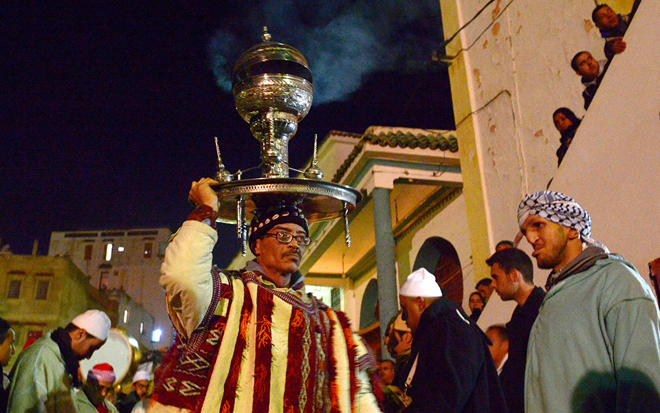 A Sufi man carry incense during the festival of Sidi Ali Ben Hamdouch on January 21, 2014 in the Moroccan village of Sidi Ali, near Meknes. The festival brings Moroccans from far and wide to venerate a 17th century Muslim saint and his servant Lalla Aicha, a mythical Muslim princess from the desert who dwells in the spirit world and is a powerful unseen force for her followers. AFP PHOTO / FADEL SENNA