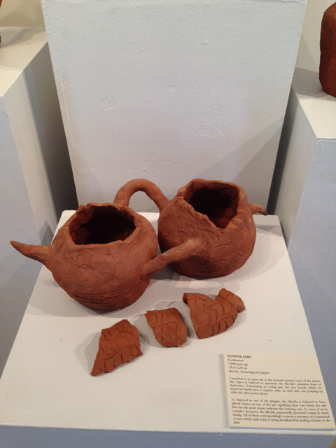 The "found" artifacts demonstrate include clay voting jars and gold plaques depicting historic events in Bla-bla society.