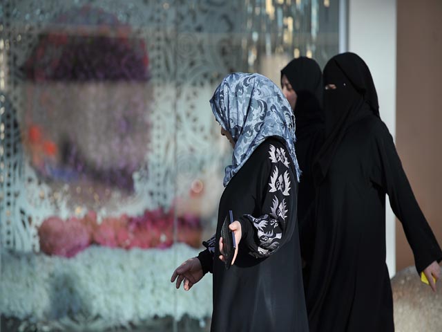Saudi women walk past a flower shop on the eve of Valentine's day in Riyadh on February 13, 2014. Red roses lurk hidden in flower shop back rooms and heart-shaped chocolates are sold under the counter, but Saudis still manage to buy Valentine's gifts and defy the religious police. Saudi Arabia applies a rigorous interpretation of Islam under which the sexes are strictly segregated and any public display of affection is completely taboo. AFP PHOTO/FAYEZ NURELDINE