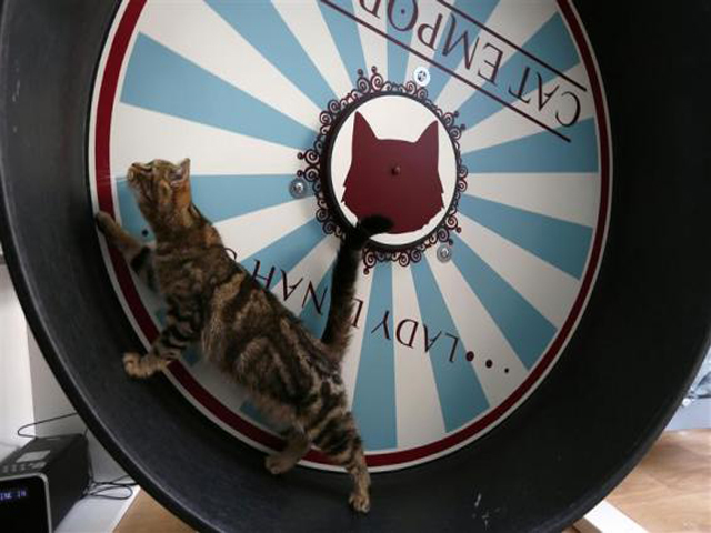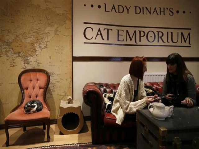Lady Dinah's Cat Emporium on the fringe of London's financial district is cashing in on an idea first popularized in Japan to allow stressed-out workers to wind down by stroking a cat while sipping a cappuccino or latte - or tea, if you prefer.