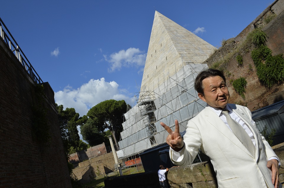Yuzo Yagi, Japanese sponsor for the restoration of the Pyramid of Cestius, poses on site on July 15, 2014 in Rome. The pyramid was built about 18 BC–12 BC as a tomb for Gaius Cestius, a magistrate and member of one of the four great religious corporations in Rome. It is made of brick-faced concrete covered with slabs of white marble standing on a travertine foundation. AFP PHOTO/Andreas Solaro
