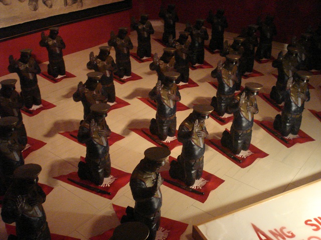 In another section of the exhibit, de Chavez’s installation “Litanya ng tatlumpu’t dalawang sumasampalataya” (Litany of thirty-two believers) joins Benedicto Cabrera’s charcoal and chalk painting “Soldiers”. De Chavez tackled the Tagalog movement Lapiang Malaya with 32 figures depicted with their right hands raised as if reciting a creed, while in front of them is a fragment of red text from the credo of this supposed fanatical nationalist crusade that thrived from the 50s to 60s: "Ang sino man na may gusto sa pagiging alipin ay sumama sa Americano/Ang may gusto ng calayaan ay sumama sa Tagalog."