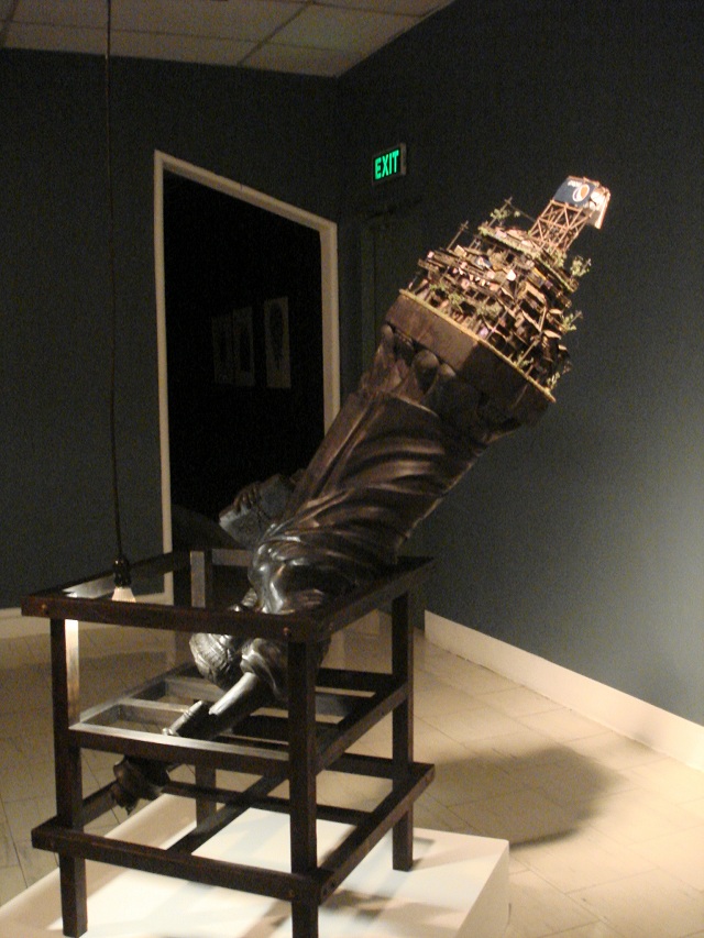 His other work, a sculptural installation called “State of your Liberty,” is an upended Statue of Liberty, and on its top side is a miniature terraced shantytown redolent of Metro Manila’s urban squalor.