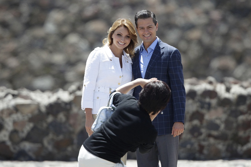 Japan's First Lady Akie Abe takes a picture of Mexico's President Enrique Pena Nieto and First Lady Angelica Rivera during a tour of the Pyramid of the Sun at the Teotihuacan archaeological site, on the outskirts of Mexico City, July 26, 2014. Abe's husband, Japanese Prime Minister Shinzo Abe, is on a two-day official visit to Mexico. REUTERS/Daniel Becerril
