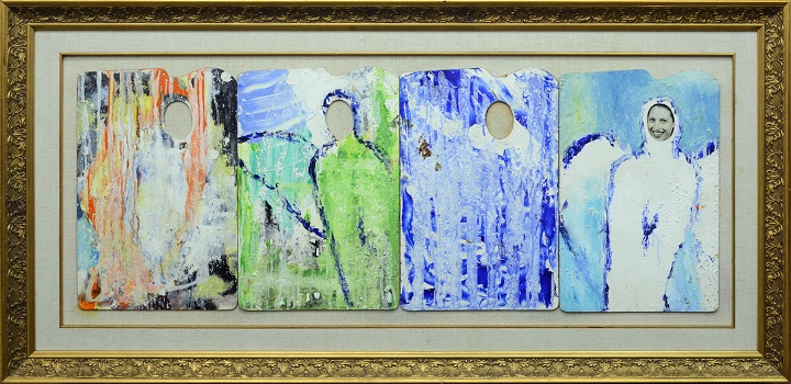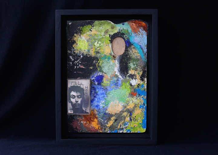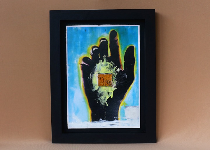 Modesto’s piece, “T. S, Eliot,” is a collage containing a dried and brittle twig and a painting of a red figure almost obliterated by blue shadows. It alludes to Eliot’s famous poem, “The Love Song of J. Alfred Prufrock,” which tells a depressing message about ageing, alienation, decay, depreciation, indecisions, paralysis, sadness, and death.