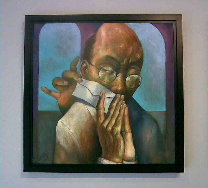 This same theme is also tackled in “Madasalin,” a surrealist work which foregrounds the profile of a bald and bespectacled official, whose hands are clasped together as if in prayer while a third hand appears from behind him, offering him a white envelope.