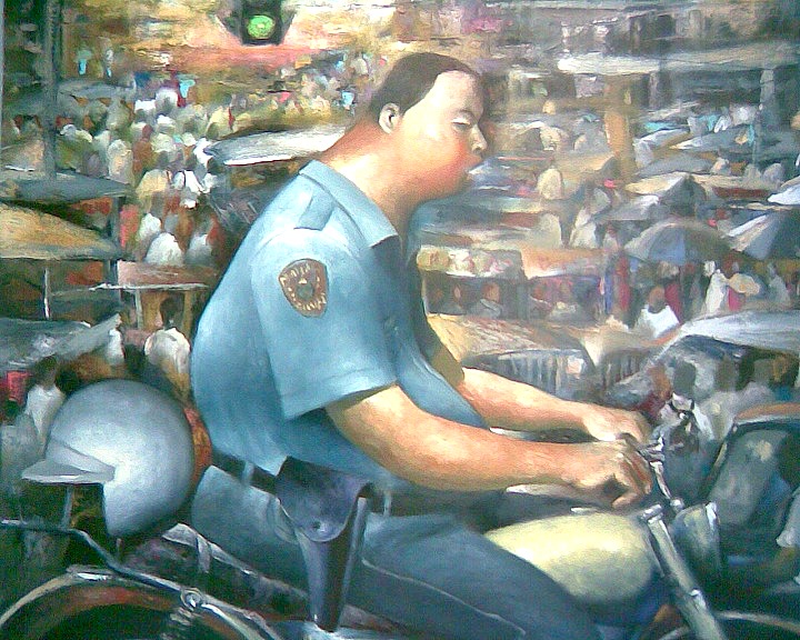 “Enforcer” portrays a blue-uniformed policeman straddling his motorcycle amidst the horror vacui mishmash of vehicles, people and market vendors that make up the daily bedlam of Manila’s urban chaos. The painting’s focus is on the lackadaisical profile of the slouching and big-bellied officer, an icon which reminds us of the attitude of normalcy and inattention with which we treat the pervasive lack of discipline among motorists and pedestrians in our diurnal comings and goings within the city’s concrete maze.