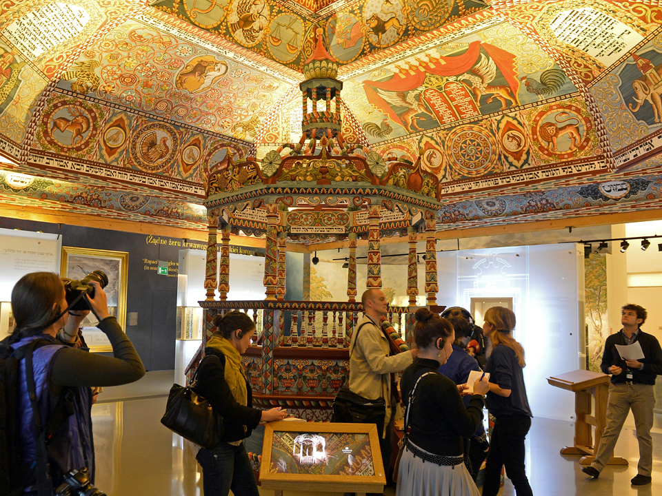 The highlight of the exhibition is a replica of the polychrome painted ceiling of an 18th-century wooden synagogue from the pre-war town of Gwozdziec, now a part of Ukraine.