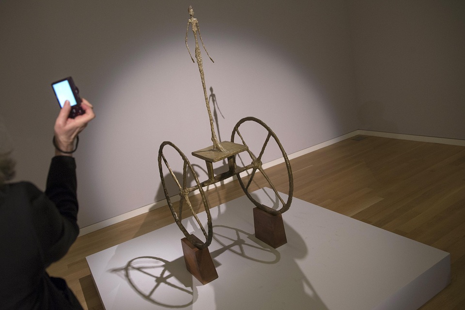 A woman takes a photo of "Chariot" by Alberto Giacometti during a media preview at Sotheby's auction house in New York, October 31, 2014. The Giacometti is estimated to sell for in excess of U.S. $100 million at Sotheby's evening sales of Contemporary Art auction on November 11 which is expected to bring in excess of $400 million. REUTERS/Shannon Stapleton