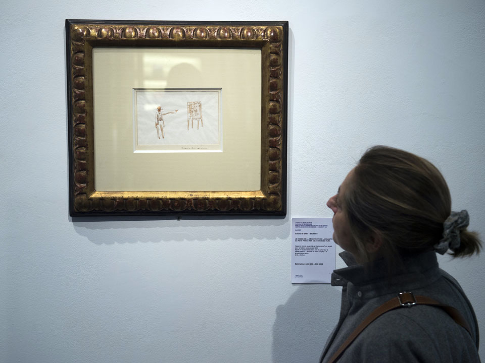 A woman looks at a watercolor from Antoine de Saint-Exupery showing the Turkish astronomer who discover the planet of "The Little Prince" on November 27, 2014 in Paris. The painting valued between 400 000 and 500 000 euros will be auctioned next December 9. AFP PHOTO / MARTIN BUREAU