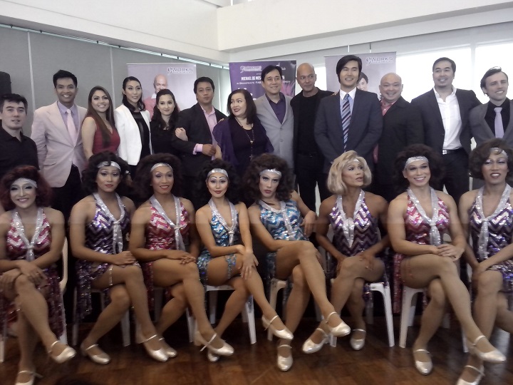 The cast and production team of 9 Works Theatrical's 'La Cage aux Folles' pose for the camera during the press conference in Rockwell, Makati City on February 10, 2015.