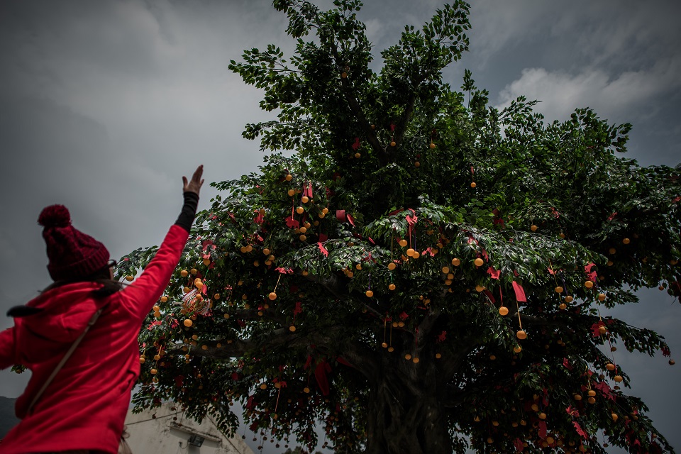In this picture taken on February 19, 2015, a woman wearing bright red for good luck throws her wish onto the branches of a special tree in the remote village of Lam Tsuen of Hong Kong's new territories. Carnivals and fireworks are Hong Kong's trademark Chinese Lunar New Year celebrations—but tens of thousands of people also travel to a remote village to hurl oranges at a tree in hopes of making their wishes come true. AFP PHOTO/Philippe Lopez