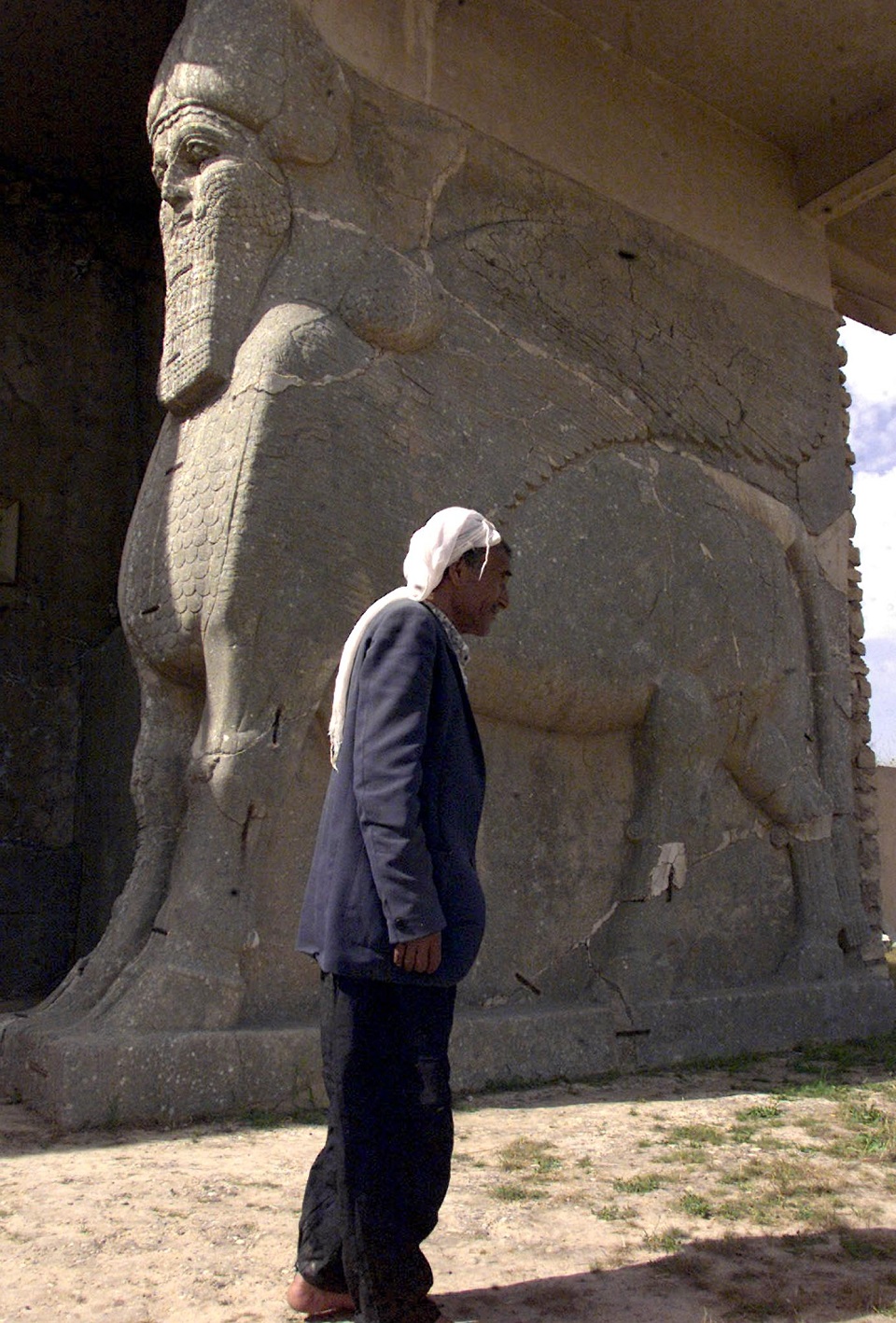 A picture taken on April 21, 2001 near Mosul shows an Iraqi worker next to the ancient statue of a winged bull with a human face at the archaeological site of Nimrud. The Islamic State group has begun bulldozing the ancient Assyrian city, the Iraq government said on March 6, 2015 in the jihadists' latest attack on the country's historical heritage. Nimrud was built in the 13th century B.C. during Mesopotamia's Assyrian era. AFP PHOTO/Karim Sahib