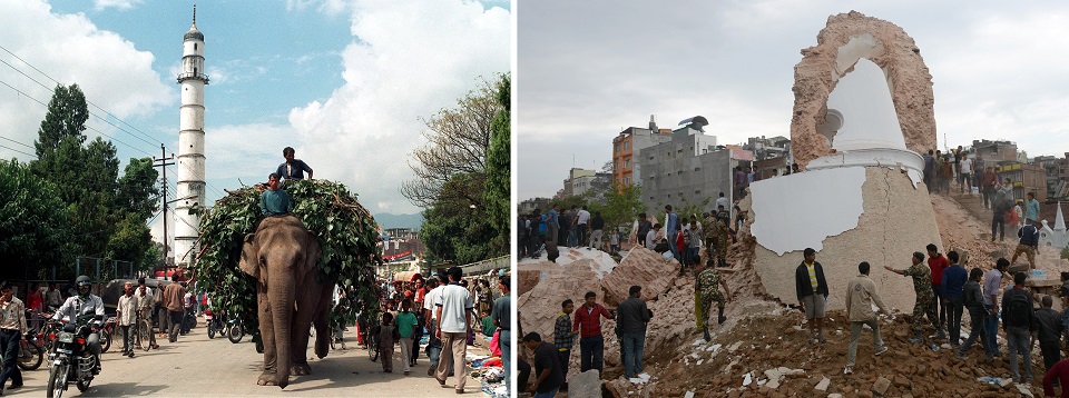 In this combination of file photographs created on April 26, 2015, a Nepalese mahout rides an elephant past the 19th century Dharahara Tower in Kathmandu on October 27, 1998 (L), and rescue members and onlookers gather at the base of the collapsed tower following an earthquake on April 25, 2015 (R). Rescuers in Nepal searched frantically April 26, 2015, for survivors of a quake that killed more than 2,000, digging through rubble in the devastated capital and airlifting victims of an avalanche at Everest base camp. AFP PHOTO/Devendra M. Singh/Prakash Mathema/Files