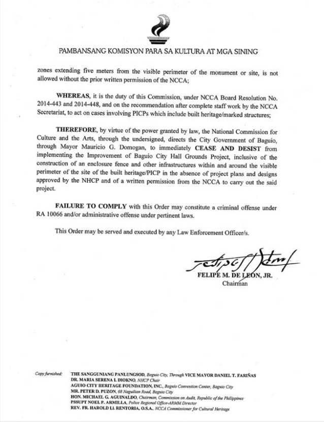 The National Commission for Culture and the Arts has issued a cease and desist order to the Baguio City government to stop the Improvement of the Baguio City Hall Grounds project.