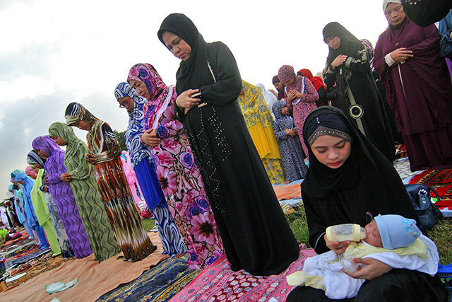 A young woman nurses her baby while others pray in front of the Quirino Grandstand in Manila during the celebration of Eid'l Adha in this photo taken October 15, 2013. Danny Pata