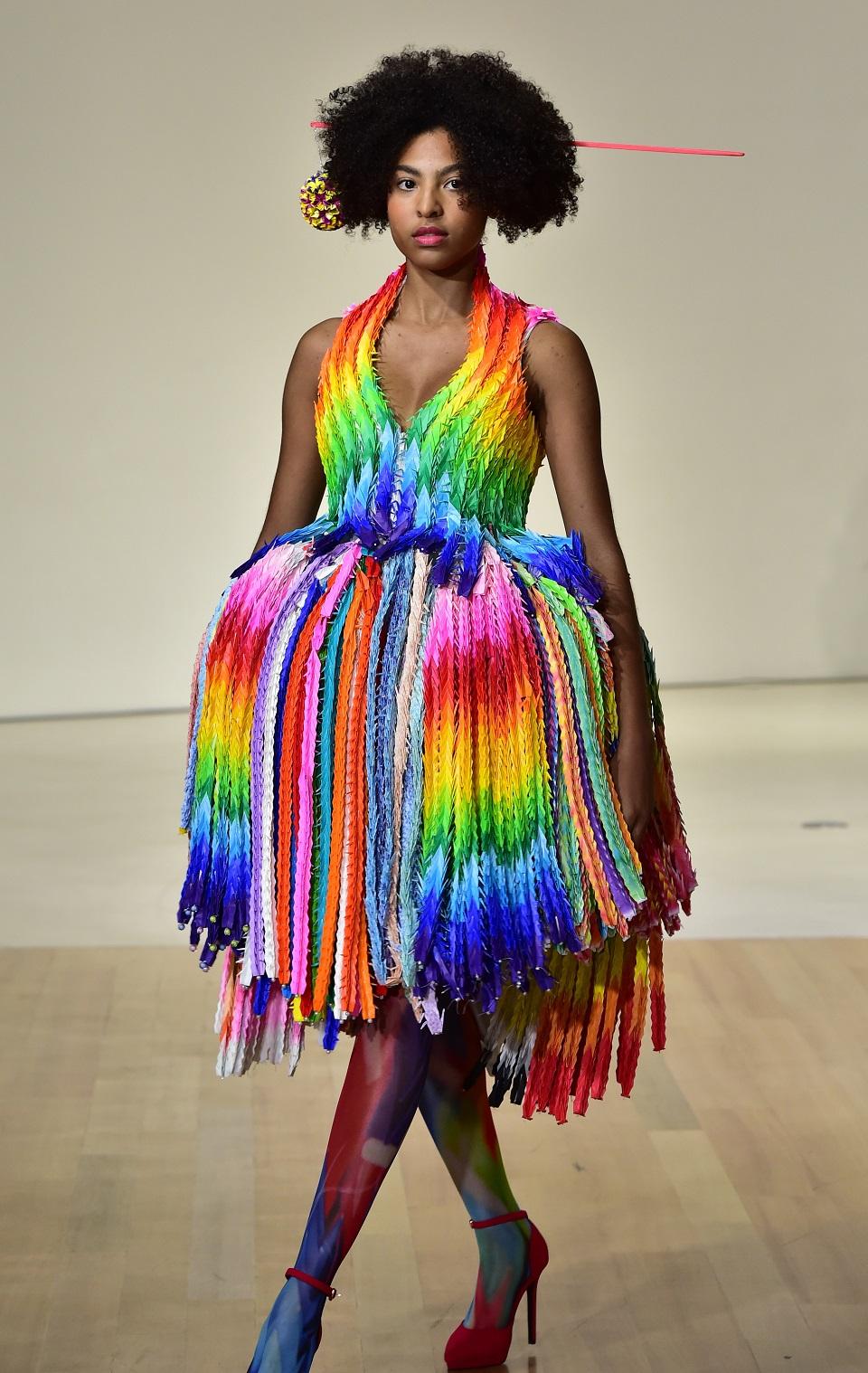 A model displays a dress made from thousands of folded paper cranes, which were obtained from a memorial monument for young victims at Hiroshima's Peace Memorial Park, during designer Takafumi Tsuruta's "tenbo" 2016 spring/summer collection show in Tokyo on October 13, 2015, at Tokyo Fashion Week. AFP PHOTO/Yoshikazu Tsuno