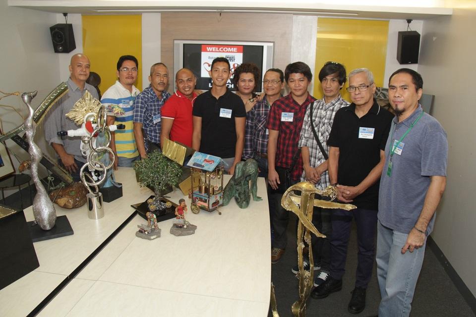 Some of the participating artists of the Alay Sining 8 showcase their sculptures during media briefing for the exhibit.