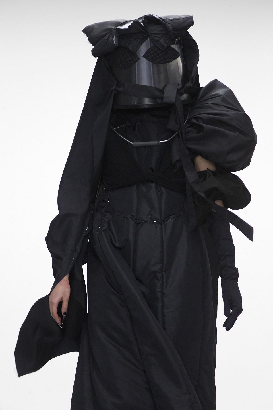 The London-born designer set the tone with an ensemble that included an upturned black bucket gilded with strips of tissue worn on the model's head, recalling Star Wars arch-villain Darth Vader.