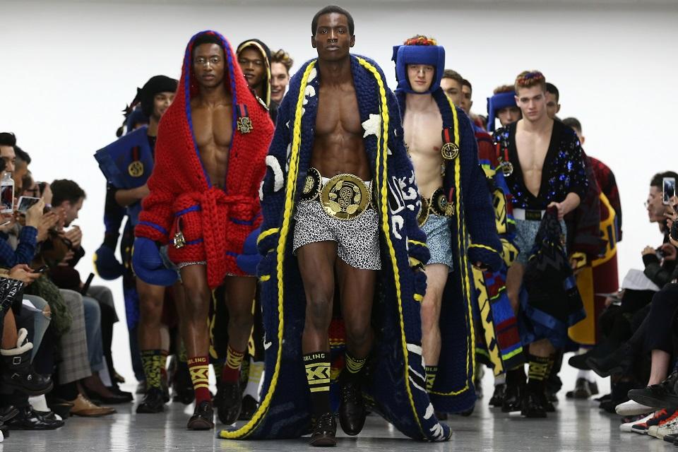 The catwalk became a ringwalk as male models paraded in thick woollen hoodies decorated with medals, inspired by boxers' robes.