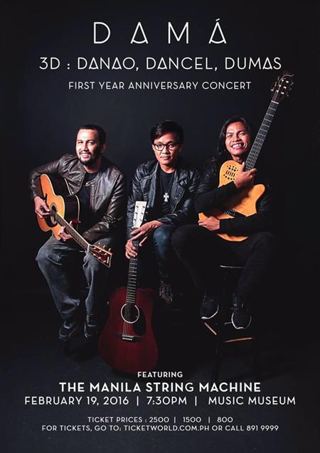 Dama: 3D The Anniversary Concert will happen on February 19, 2016 at the Music Museum. Tickets at P2500, P1500, P800. For tickets visit ticketworld.com or call 891-9999