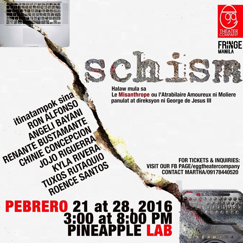 The last two shows of "Schism" will be performed on February 28 at 3 p.m. and 8 p.m. at Pineapple Lab, R. Palma Street in Rockwell, Makati. Tickets are priced P500. Visit Egg Theater Company's Facebook page or contact 0917-8440520.
