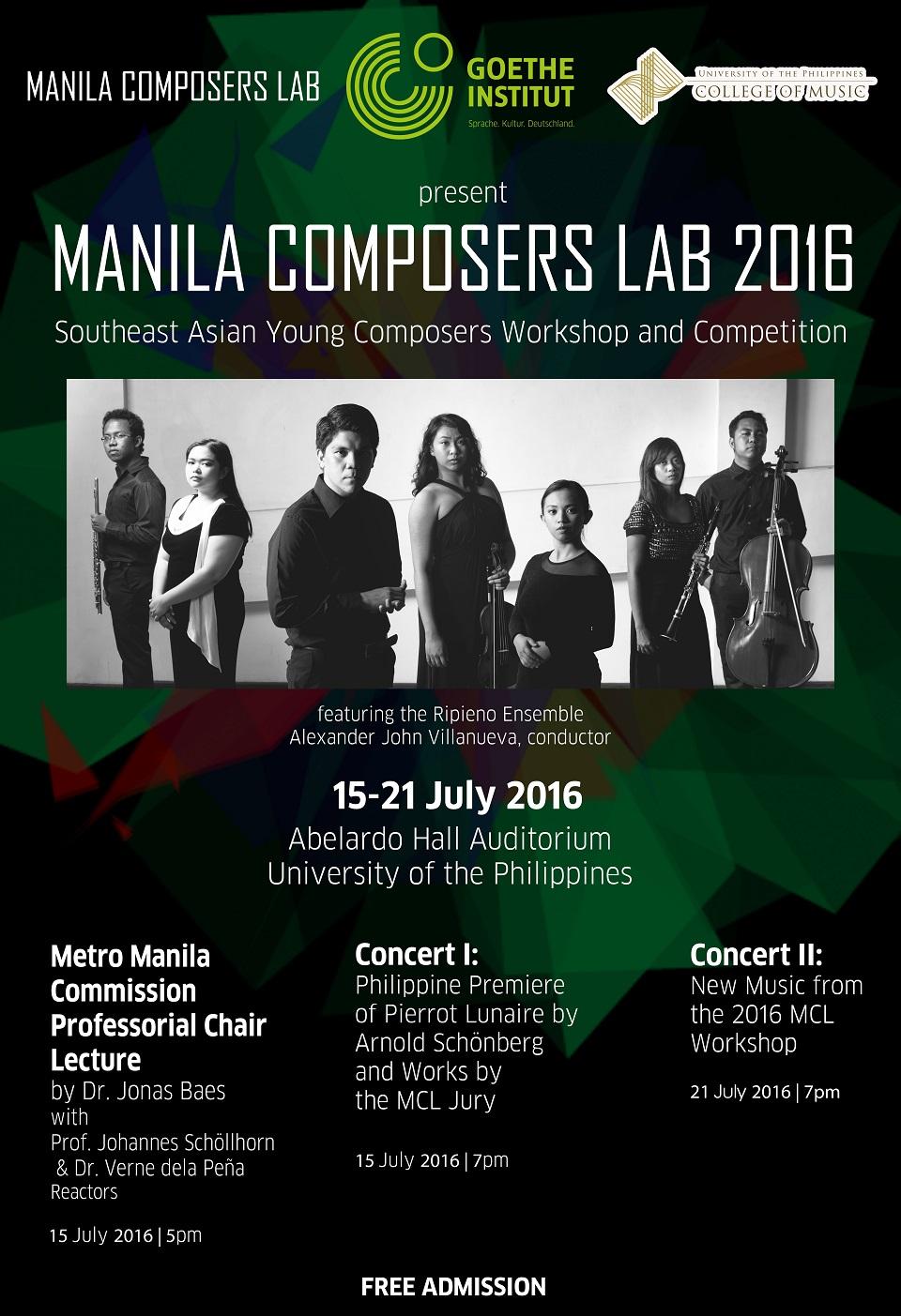 The Manila Composers Lab: Southeast Asian Young Composers Workshop and Competition will be held from July 15 to 22 at the UP Diliman College of Music. Admission is free.