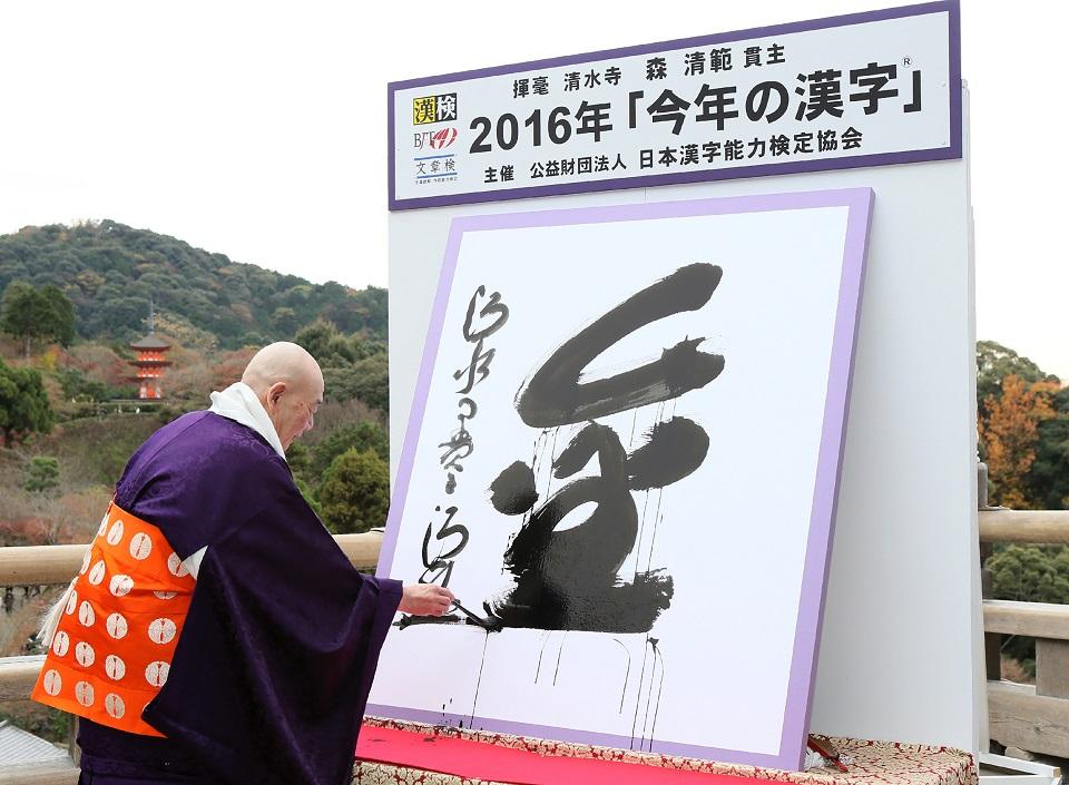 At a ceremony thronged by tourists, Seihan Mori, the chief priest of the Kiyomizu temple in Japan's ancient capital of Kyoto, drew the character, which can also be used to signify "money," in large brush strokes.