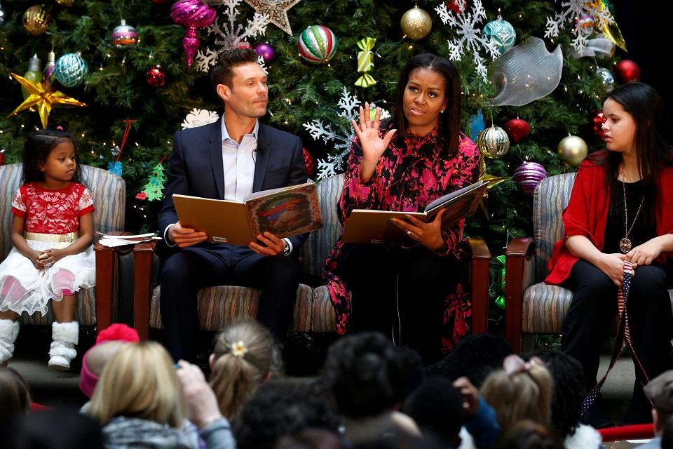 Television personality Ryan Seacrest and US first lady Michelle Obama read 'The Night Before Christmas' as they visit with patients at Children's National Medical Center in Washington, DC, U.S. December 12, 2016. REUTERS/Jonathan Ernst