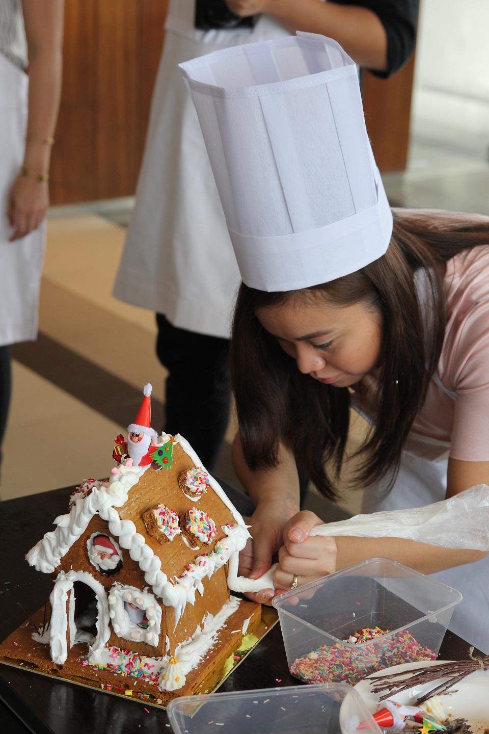 If the thought of ube cheesecake is not enough to kindle the Christmas spirit in you, you can take home a professionally made gingerbread house, also at Holiday Inn Makati. As part of the media familiarization tour, we were given instructions on how to build our own gingerbread houses. Ours barely made the passing grade compared to how the real pastry chefs do it; mine did not make it in one piece as I took it home that evening!