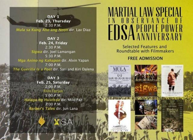 The University of the Philippines Film Institute (UPFI) Film Center is observing the anniversary of the EDSA People Power Revolution from February 23 to 25 through a Martial Law Special.