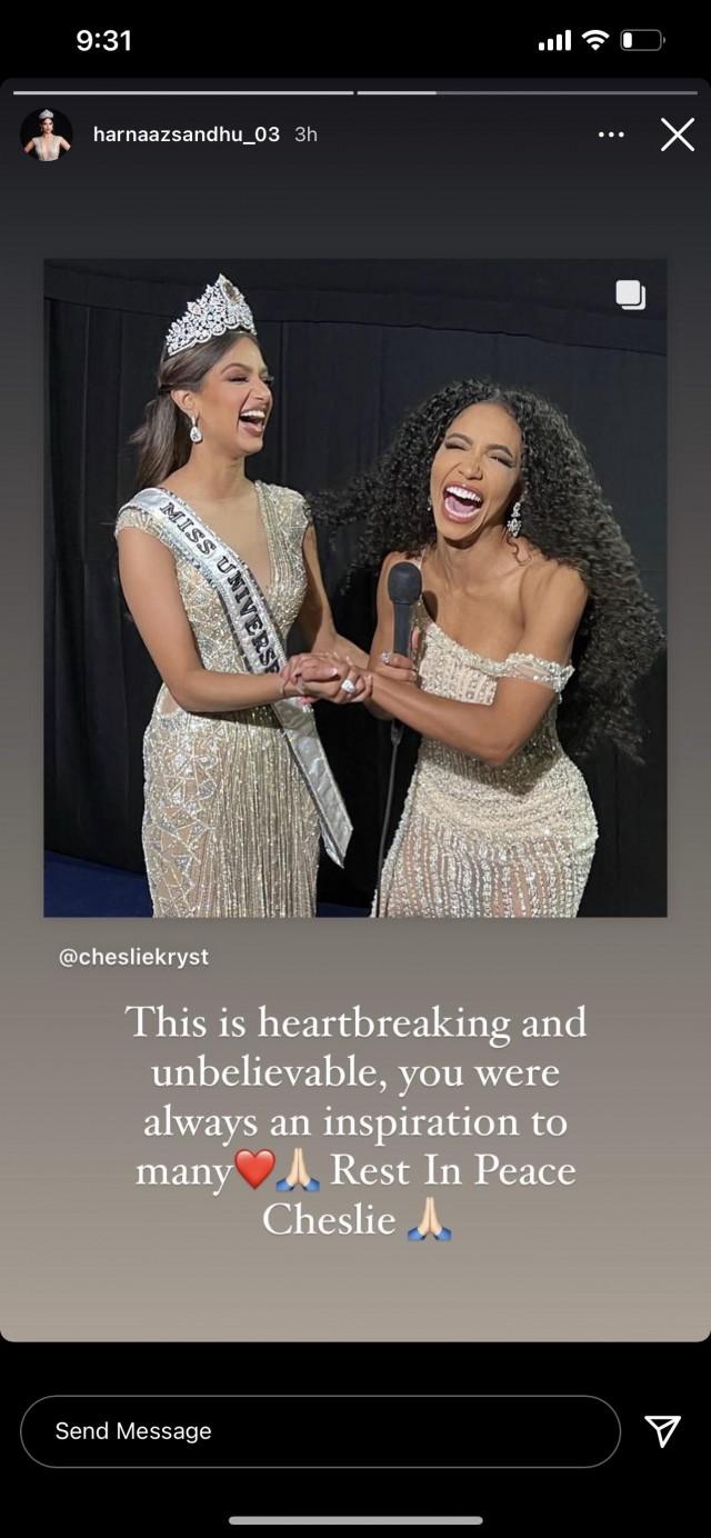 Reigning Miss Universe, Harnaaz Sandhu from India, shared a photo she took with Cheslie after her coronation last December.