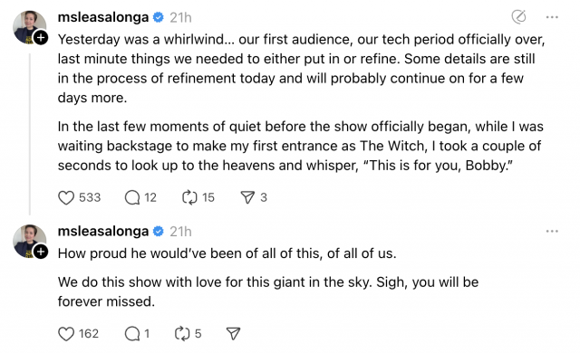 "While I was waiting backstage to make my first entrance as The Witch, I took a couple of seconds to look up to the heavens and whisper, 'This is for you, Bobby'," Lea narrated.