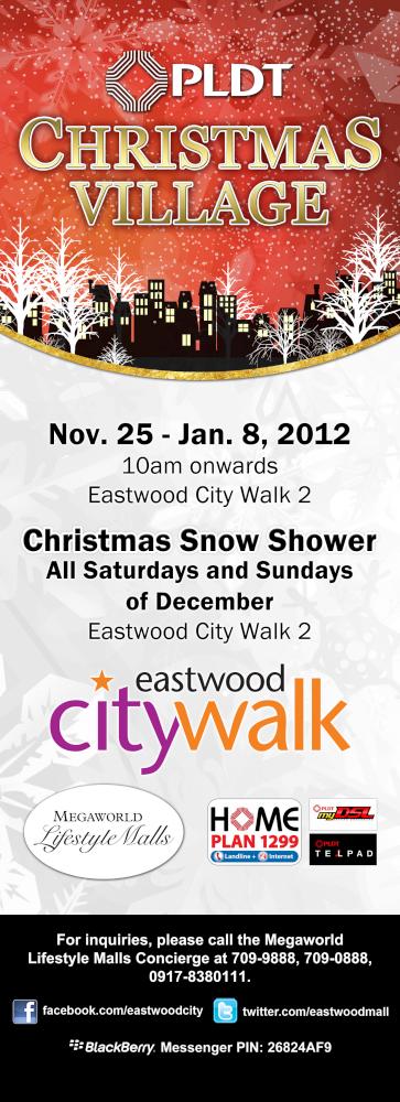 Those who dream of a white Christmas no longer have to book a trip to a far off land to experience snow as PLDT promises evening snow showers at its Christmas Village in Eastwood, which will be open even on December 24 and 25, starting at 10 a.m. to around midnight. The snow is scheduled to fall at 6 p.m and 8 p.m., and the best part is, it's open to the public! The snow showers will continue nightly until January 8, 2012. –KG, GMA News