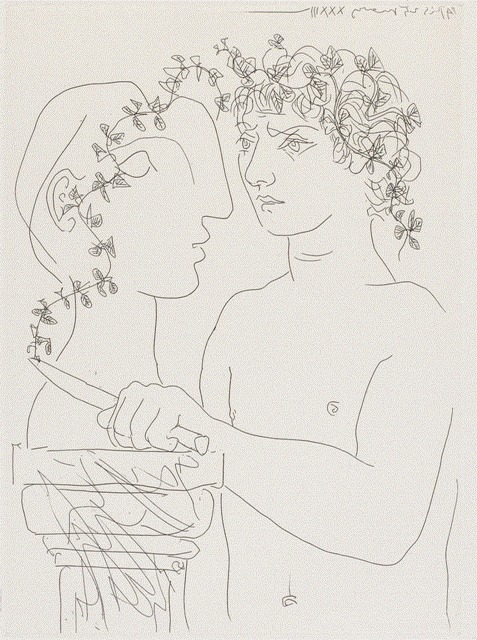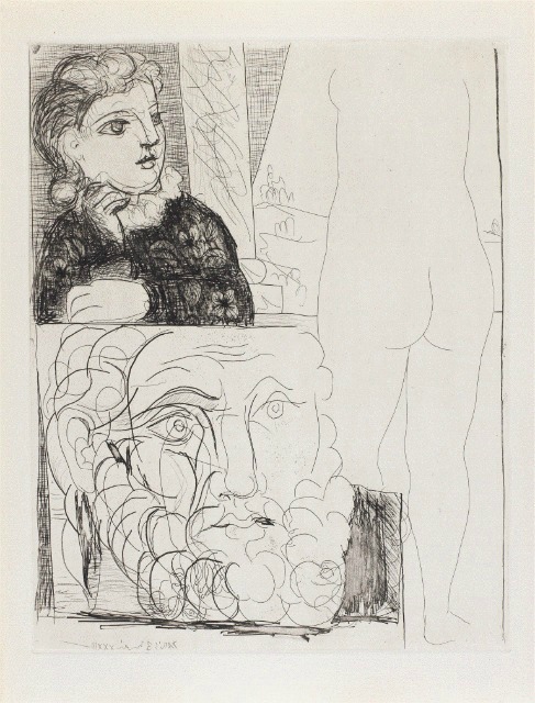 There is reason for the optimism. The “Suite Vollard” may not be as famous as Picasso’s cubist work, or those now labeled part of his Blue or Rose periods, but that is precisely why it is extraordinary work. Let go of preconceived notions of what a Picasso work must look like, let go even of its consideration as his tribute to classicism, and what you have is an aesthetic that is nothing but black on white, in etchings and aquatint and drypoint. From afar and collectively, it seems more bare than you’d expect. Of course up close the brilliance is in the details, the differences among repeated images about the minor shifts in perspective, the addition of one thing, another person, a window in the background, flowers on the windowsill, into the mix.