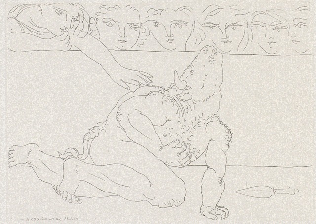 The introduction to the collection safely falls under “Miscellaneous,” under which the more disparate – therefore more interesting – images fall. Here were images of the circus, of women in contemplation, of women’s bodies being uncovered by fawn in one plate, man in another. Here some of Picasso’s images fall back on cubism as aesthetic, others reveal how Picasso’s sense of the human body is one that has breadth and scope and possibility, where sensuality is in the pose and posture, where sex is necessary undertone.