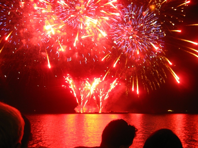 Australia’s soundtrack turned out to be a medley of movie theme songs—the fanfare from “2001: A Space Odyssey” melted into “Eye of the Tiger,” the “Rocky” theme, and on to the “Pink Panther” song. The Aussie team’s fireworks evolved with the music, from all-gold fountains that trickled into the sea, to colorful explosions that made the black canvas of night sky look like Jackson Pollock’s handiwork. After an intermission that felt too long for the excited audience, it was Canada’s turn to seize the sky. Their display began with a lot of low-flying fireworks dancing to a slow, pensive tune in perfect precision. As the music gave way to Amanda Marshall’s “Let it Rain,” the pyrotechnics seemed to heed the words as they rose higher and burst in a torrent of sparks.