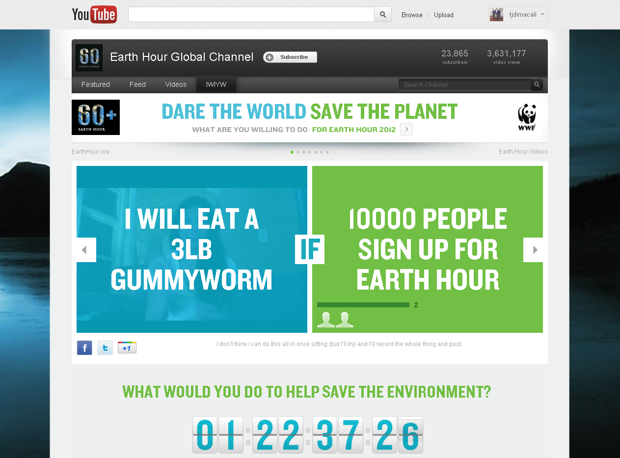 The Earth Hour YouTube channel posts videos from viewers willing to pledge to do a personal challenge for Earth Day 2012.