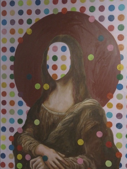 Color and design meanwhile merge together in the proliferation of polka dots across the canvases, as part of the backdrop yes, but even more so as intervention upon the images themselves. The Mona Lisa’s face and the head of “The Son of Man” are filled with polka dots, too, highlighting how these might be of the background on the one hand, but also the foreground on the other, but only and but part of the main image. The use of the polka dots as such decentralize the image that is familiar, making it but one of the things happening on each canvas.