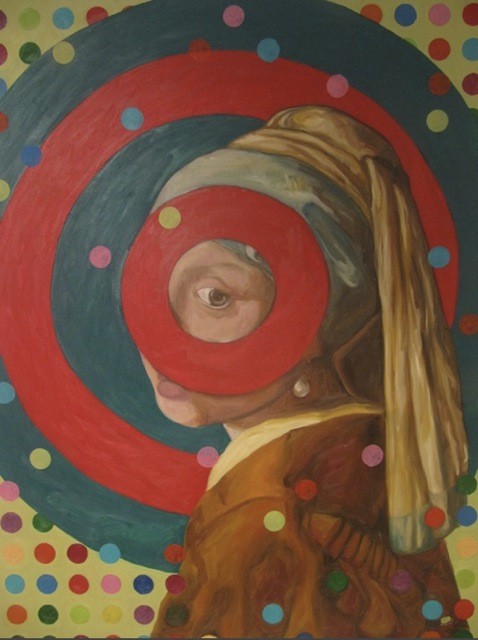 And then there’s the “Girl with a Pearl Earring” who we have been told is all about those eyes, looking at you from within that canvas, the body in seeming movement away from you, but the head turned toward you, mouth open as if in almost speech. In this version of Cruz’s this image is framed in the background, but more importantly in the foreground, with a bullseye. What is thus the bigger image here looks like a dartboard, whose center is precisely the girl’s eye—the one that’s celebrated and (over-)analyzed, the one that we are made to consider upon viewing this image. Here, without much of the girl’s face, we are forced to reckon with it as object in itself, and in that sense it’s the strangest of renderings, as in the task of highlighting what we have been taught is the image’s center, we are also forced to let go of what else is there.