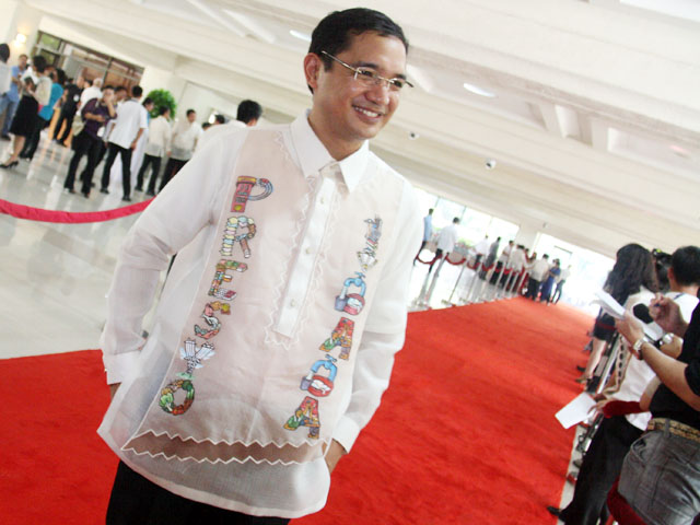 Just like last year, President Benigno Aquino III wore a barong by designer Paul Cabral, but this time without a yellow ribbon pinned to it. Bayan Muna representative Teddy Casiño (left) continued his tradition of wearing his sentiments on his sleeve—or in his case, his entire front, as his Edgar San Diego barong was emblazoned with the words “Presyo Ibaba” as a protest against rising prices in the country. Other politicians espousing their advocacies through their outfits include former Akbayan Rep. Risa Hontiveros-Baraquel (right), whose gown had a “north meets south”