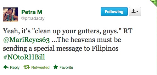 When I went online, I saw that there were suddenly no other subjects besides the rain. Here were tweets saying what streets were neck deep, knee deep, hip deep. Here were the maddening declarations that God had sent the storm to punish the Philippines for supporting birth control. Here was my friend Petra snapping back.