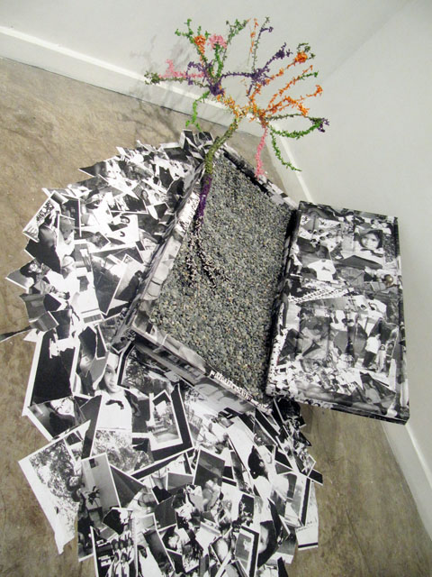 Outside the main gallery, these silences and their weight, and the flimsiness of memory, are in three other works. Mimi Tecson’s “Rocking the Cradle” is a bright red structure atop one of cement post that frames a section of the garden. More like four different towers standing together, strings in red, yellow, green emerge are tied to it on one end, the gallery compound’s walls on the other. The effect is playful, with the strings hanging loose even as they attach to the house in a pattern, and it reminds of the instabilities that nurturing lives off, the kind of freedom we allow away from home, the ties that bind which are numerous and complex. Ling Quisumbing Ramilo and Tecson's "Once Upon a Time" is an installation on and against one of the garden’s larger trees, of what looks like a house made from found objects: long thin rods on which it stands, an old cabinet with frosted doors, a roof that looks like a house by itself. From within, a light shines brightly, and beneath the structure hangs what look like fruit made of colored jacks from the jackstones we used to play as children. On the other side of the tree, more jacks form the strangest of a vine-like growth on the tree, beneath which is nestled a tiny cabinet that holds an old key. The playfulness here is clear, the brightness a contrast to the bare minimum that the installation works with, all of it a statement on childhood memory under lock and key, of the brightness now held within structures we do not control, which stand on the most unstable of grounds.