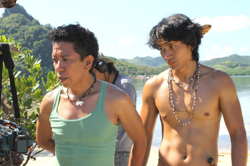 Director Auraeus Solito (left) and actor Adrian Sebastian on the set of "Baybayin."